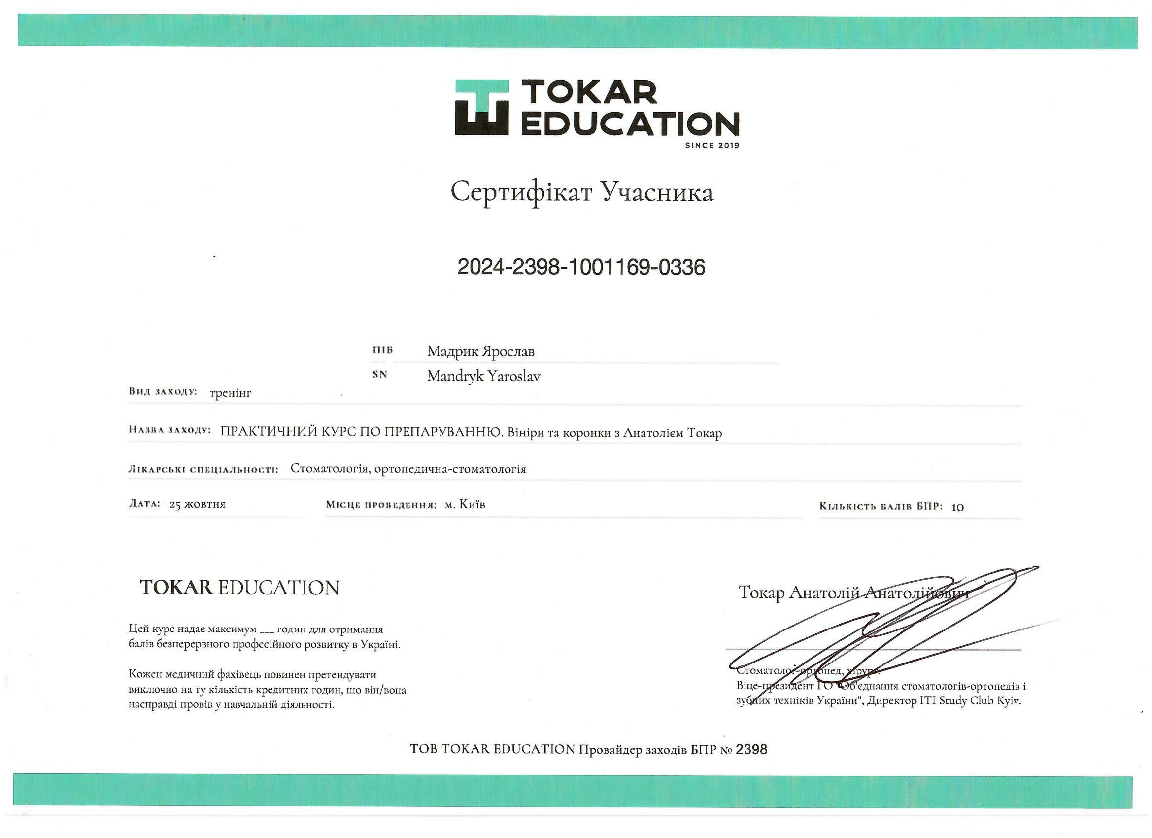 - Курс: Практичний курс по препаруванню. Вініри та коронки з Анатолієм Токар