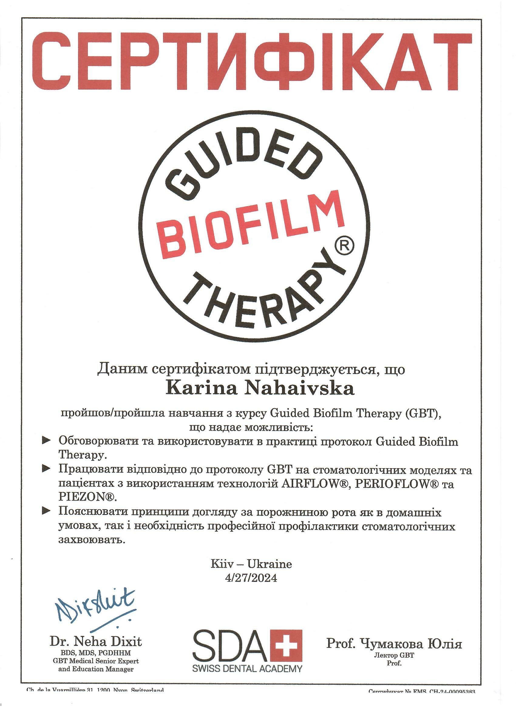 - Навчання на курсі Guided Biofilm Therapy (GBT)