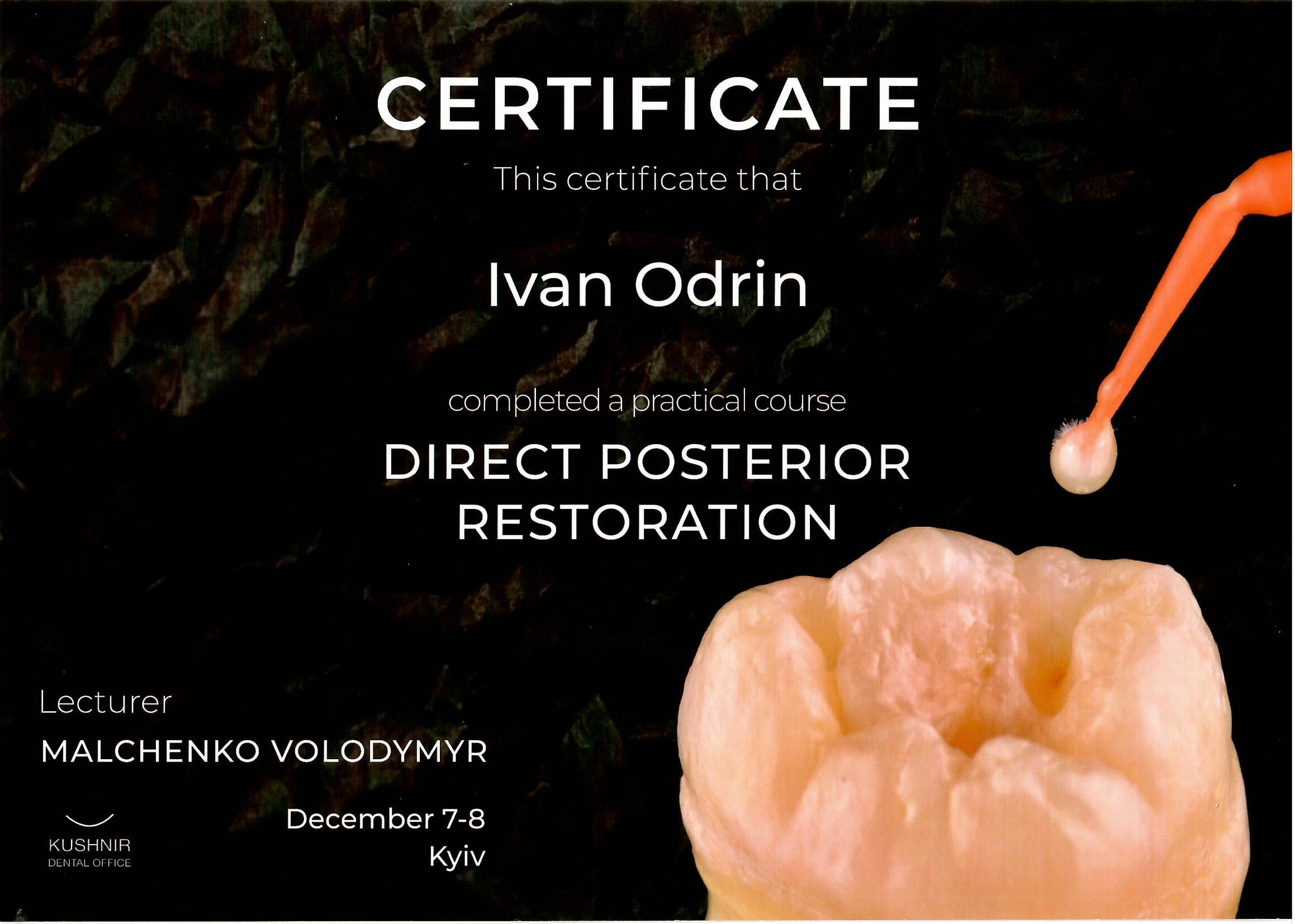 - Пройшов практичний курс DIRECT POSTERIOR RESTORATION, лектор Malchenko Volodymyr