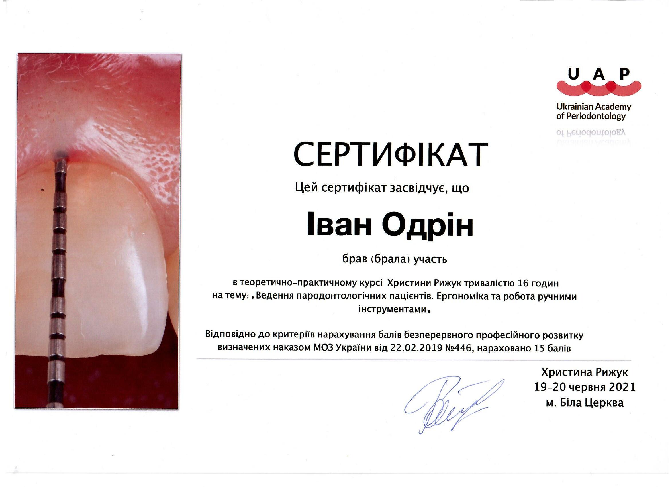 - Брав участь в теоретично – практичному курсі Христини Рижу «Ведення пародонтологічних пацієнтів.Ергономіка та робота ручними інструментами».